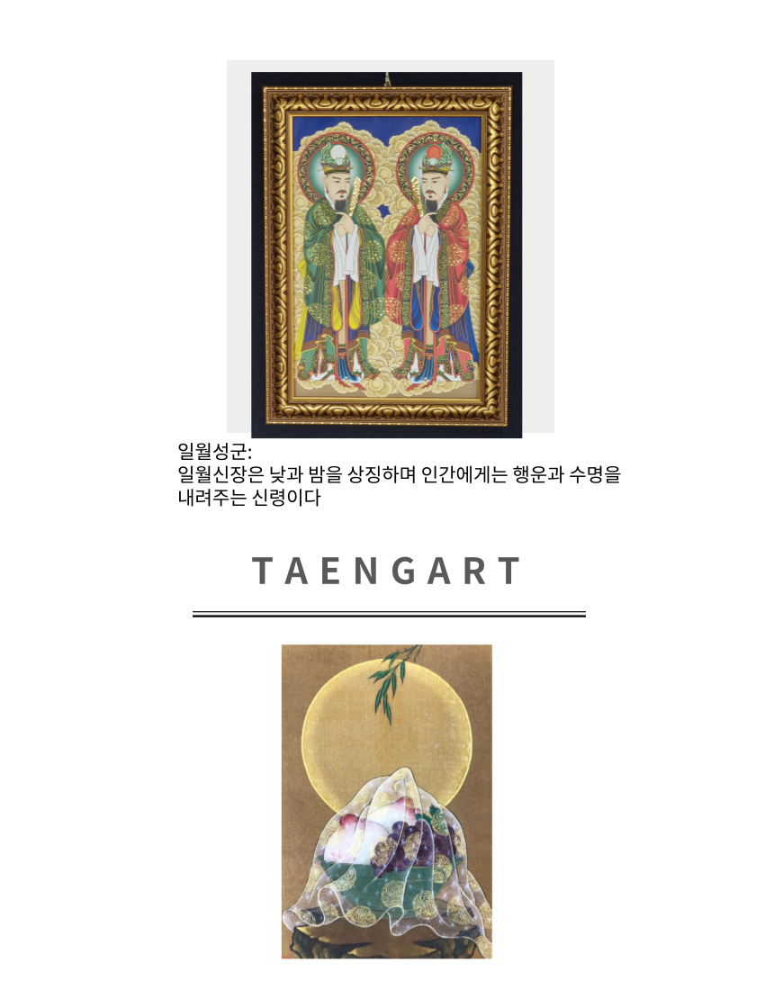 일월성군은 낮과밤을 상징하며 인간에게는 행운과 수명을 내려주는 신령이다.관에 해와달을 그려 상징적으로 표현하였고 호패와 후광 ,문양을 금으로 입체적으로 나타내고 있다.