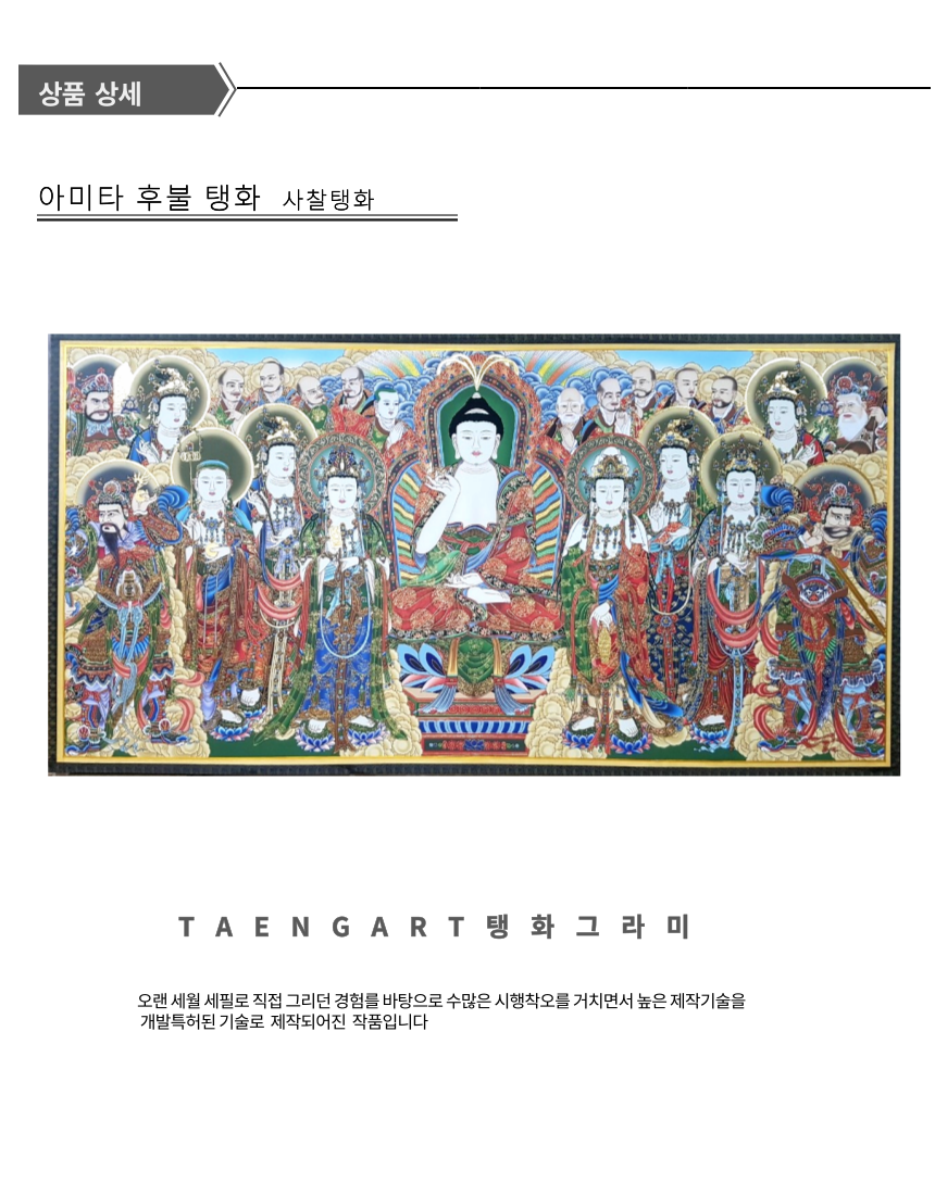 아미타불좌상을 중심으로 8대보살, 10대 제자,사천왕등으로 구성되어진다.화려한 후광과 문양등을 돋움으로 작업하여 은은하면서 고급스러운 탱화이며 주불의 온화한 상호을 하고 있다