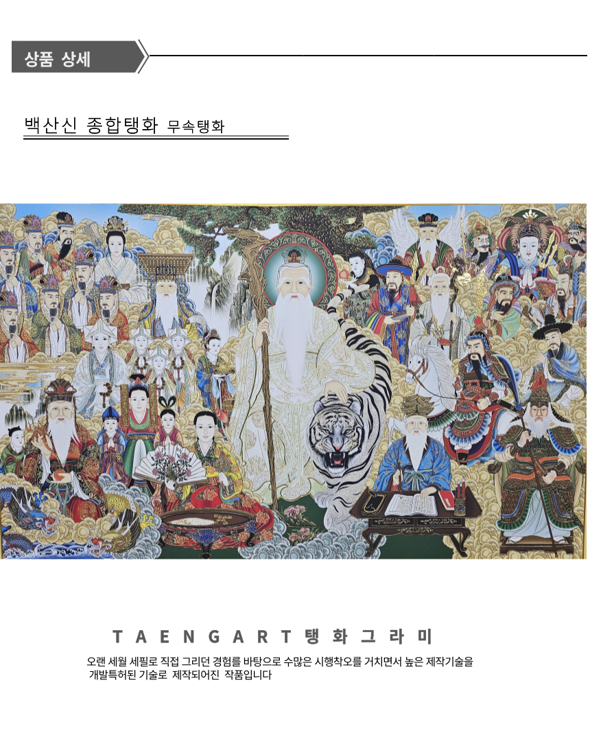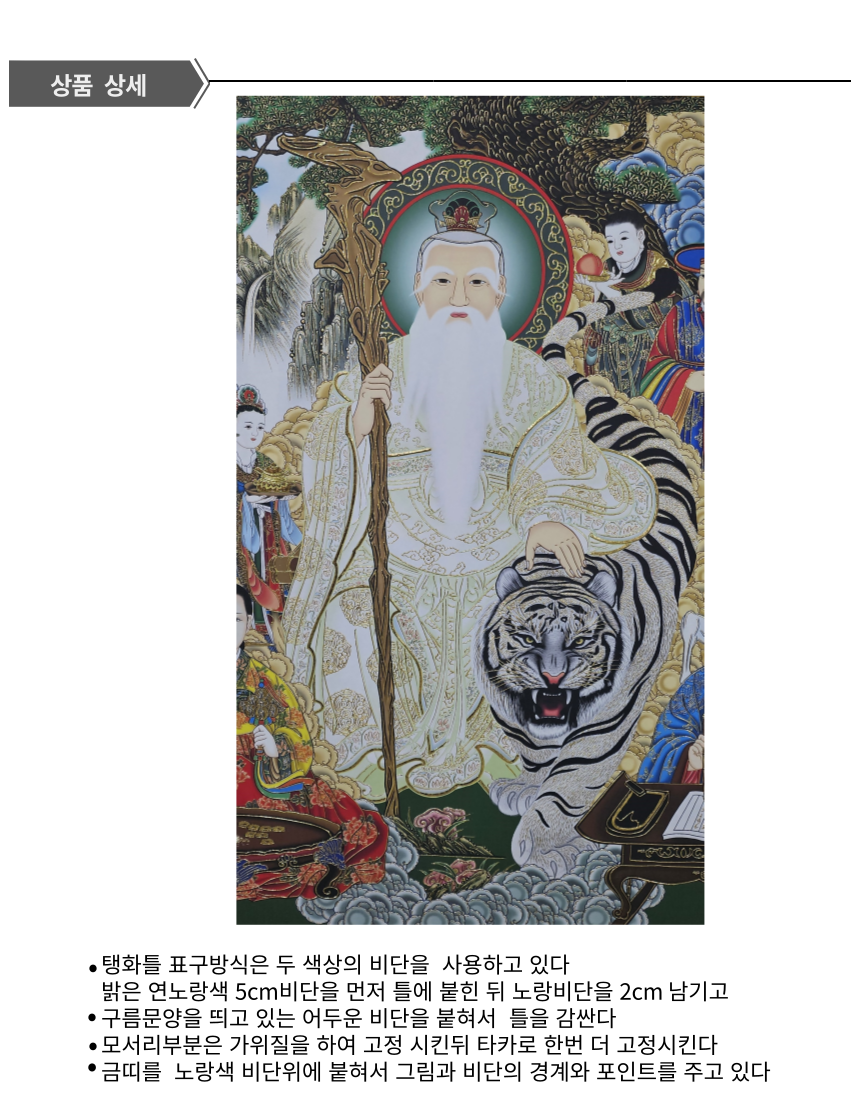 호랑이털을 하나하나 돋움으로 표현하여 입을 버리고 있는 용맹함,생동감을 더 강조한 산신과 백호가 중삼에 놓인 구도가 뛰어난 탱화이다