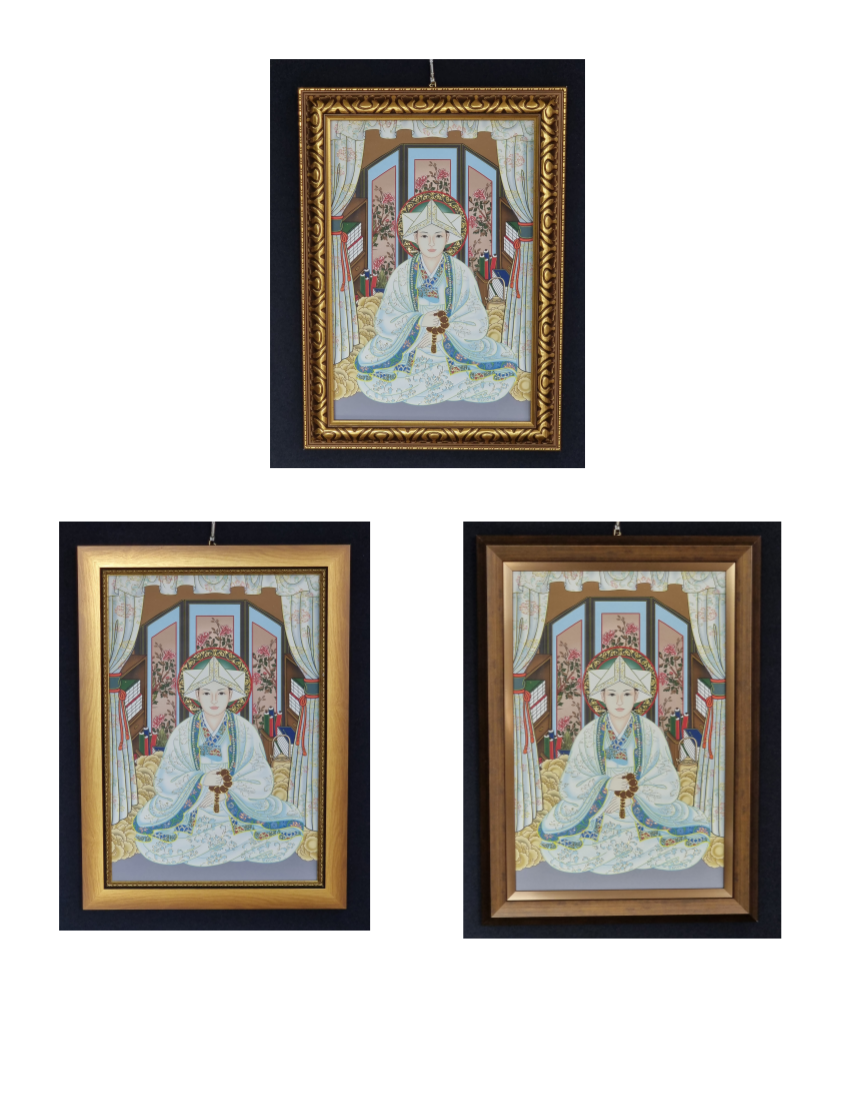 햐얀색 옷과 꼬깔,염주등을 하고 있으며 금 돋움작업으로 고급스럽다.