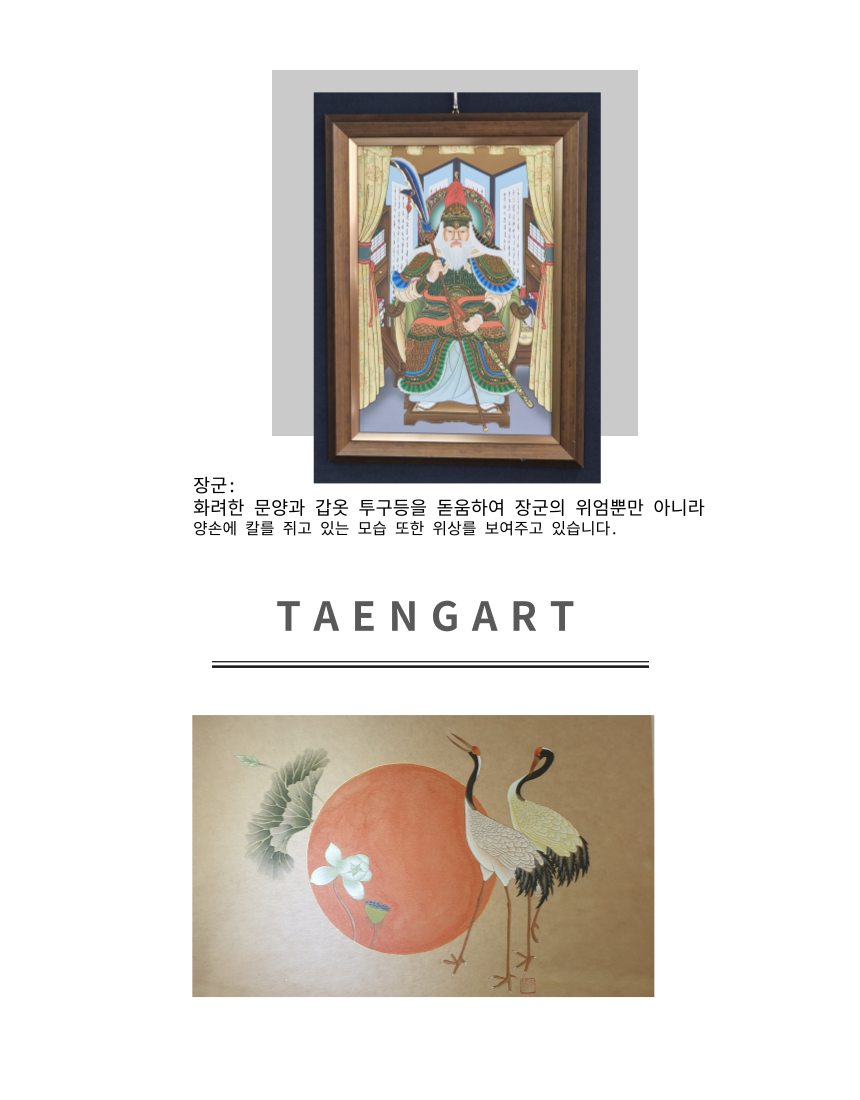화려한 문양과 갑옷 투구등을 돋움하여 장군의 위엄뿐만 아니라 양손에 칼를 쥐고 있는 모습 또한 위상를 보여주고 있다