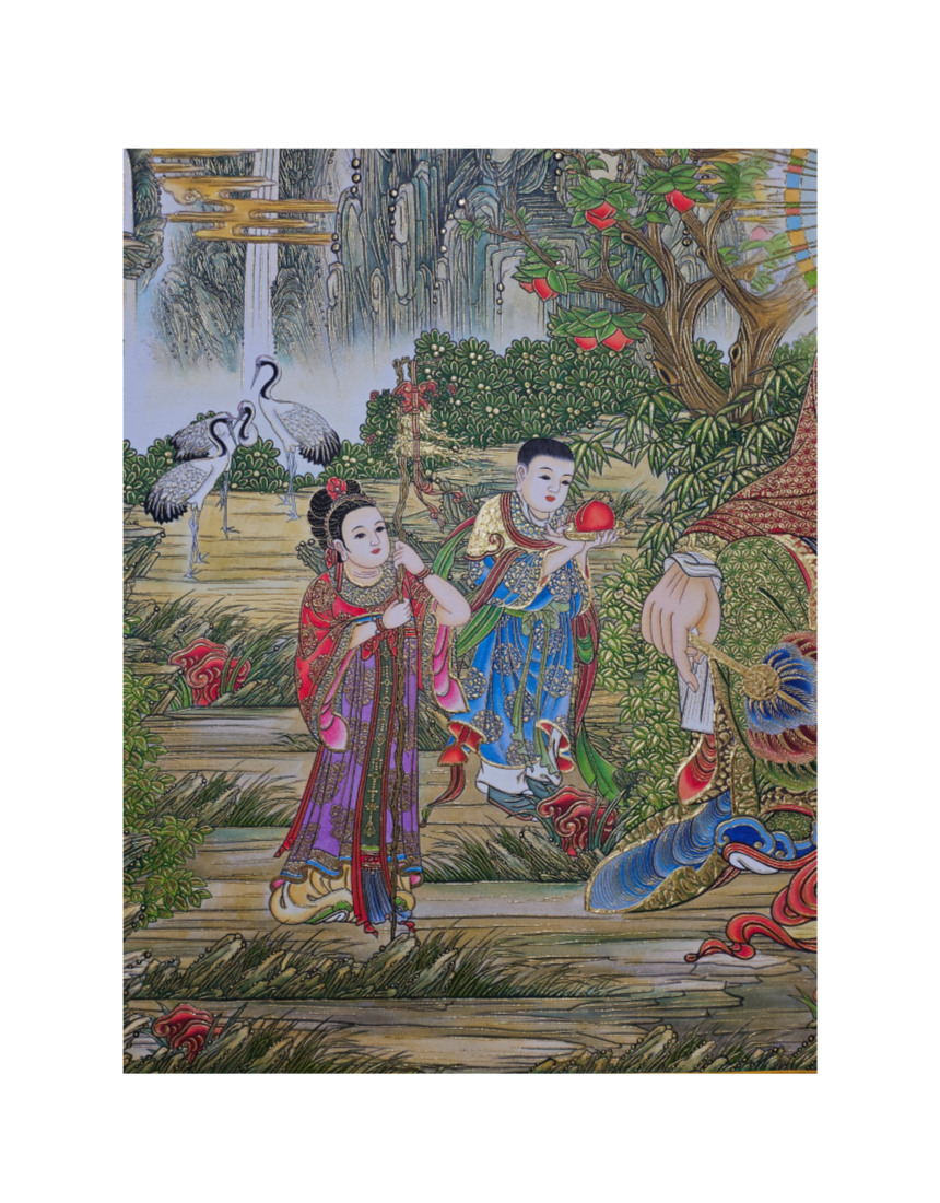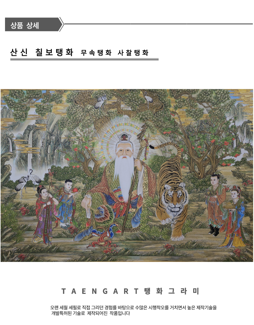 생동감있는 호랑이,산신을 보좌하는 동자동녀,자연의 배경들로 구도가 뛰어난 탱화이며 특히 마가제 한올 한올을 표현하여 사실감, 거친감,은은함,생동감,자연스러움을 다 표현하는 일곱가지 보배를 지녀다는 칠보탱화이다