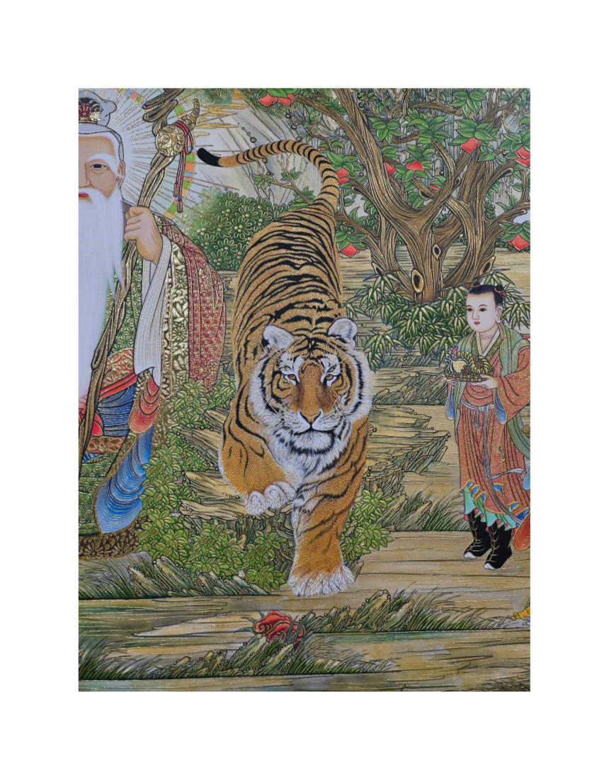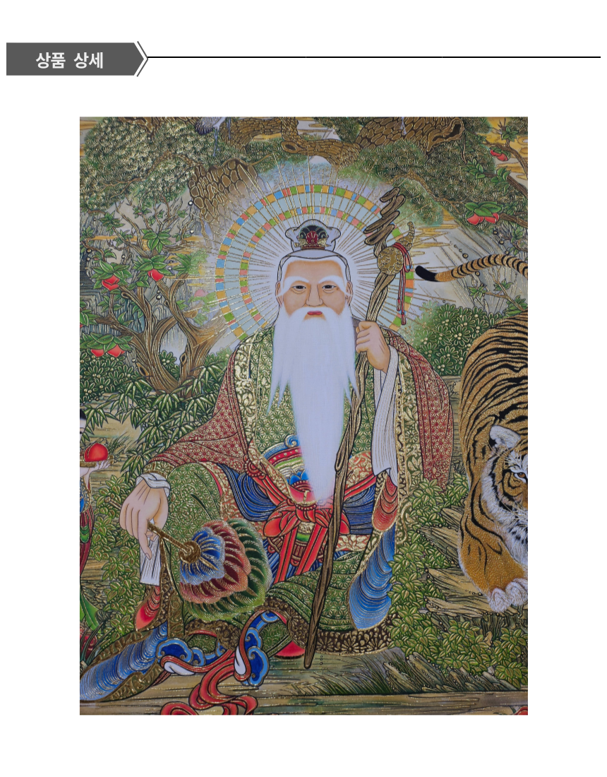 산을 관장하는 신으로 산신각에 모시는 탱화이다.산신에 전체적인 문양으로 은은함과 입체감을 주면서 오방색으로 후광이 방사함으로 위엄을 표현하고 있는 정성이 깃든 산신 탱화이다